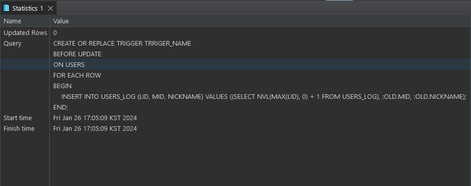 그래서 뒤에 세미콜론을 지웠더니 트리커가 잘 등록이 되어서 업데이트를 사용했는데 여전히 실패했다