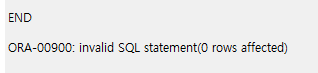ORA-00900: invalid SQL statement 이 해당에러는 오타 아니면 SQL문 맨뒤에 세미콜론이 붙어있을때 발생한다