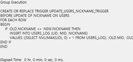 INSERT INTO USERS_LOG (LID, MID, NICKNAME) VALUES ((SELECT NVL(MAX(LID), 0) + 1 FROM USERS_LOG), :OLD.MID, :OLD.NICKNAME)